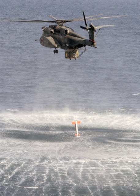 ·Un helicóptero antisubmarino recupera un UUV durante pruebas de mar (foto US Navy).