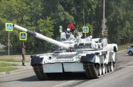 Durante los ensayos del desfile del día de la Victoria en Rusia se ha podido ver parte del material militar terrestre destinado a las acciones en el Ártico, como los carros de combate T-80, pintado de blanco con bandas grises y negras para romper la silueta de tipo “dazzle”.