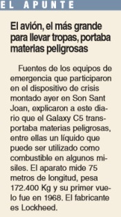 Javier Jiménez Un avión Galaxy C5, la nave más grande de transporte militar de las tropas de EEUU, aterrizó ayer de emergencia en Son Sant Joan tras sufrir un fallo en uno de sus motores. El aeropuerto, la Guardia Civil y el centro de emergencias del 112 pusieron en marcha un dispositivo especial, pero finalmente el descomunal aparato pudo tomar tierra sin problemas.Sobre las 9,25 horas, el aeropuerto palmesano recibió una comunicación urgente de los pilotos del C5, solicitando autorización para aterrizar de urgencia. El vuelo, que transportaba a 59 soldados con sus armas reglamentarias, había partido de Adana (Turquía) y se dirigía a la base de Morón de la Frontera, en Sevilla. Durante el trayecto, cerca del espacio aéreo de Balears, uno de los motores se averió y obligó a los pilotos a modificar rápidamente la ruta de vuelo. De forma inmediata, y con pocos minutos por delante para reaccionar, la Benemérita se desplegó en los alrededores de la pista. El C5, diseñado para distancias intercontinentales,pudo descender sin otros sobresaltos y el aparato fue conducido hasta el hangar de la base militar, para ser reparado. Los militares que viajaban en el interior de la nave llevaban armas cortas y largas, circunstancia de la que también fue informada la Benemérita, que es el Cuerpo policial que controla el movimiento de armas en el territorio nacional. Publicado en Ultima Hora el 21 de Junio de 2013 http://ultimahora.es/ |