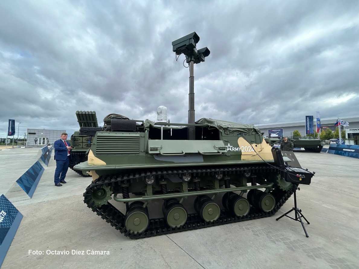 Ambos vehículos oruga Plastun-SN forman un binomio C-UAV especialmente eficiente. Sus operadores manejan unos equipos de control que pueden sacar del vehículo oruga para, mediante un cable, manejar los sistemas a distancia e incidir en una menor vulnerabilidad propia, a lo cual también incide el hecho de que se usan dos vehículos que pueden trabajar alejados uno del otro. Este medio de Rusia que da movilidad al sistema lo fabrica la compañía Russkiie Vezdekhody Plastun que tiene su sede en San Petersburgo. (Octavio Díez Cámara)