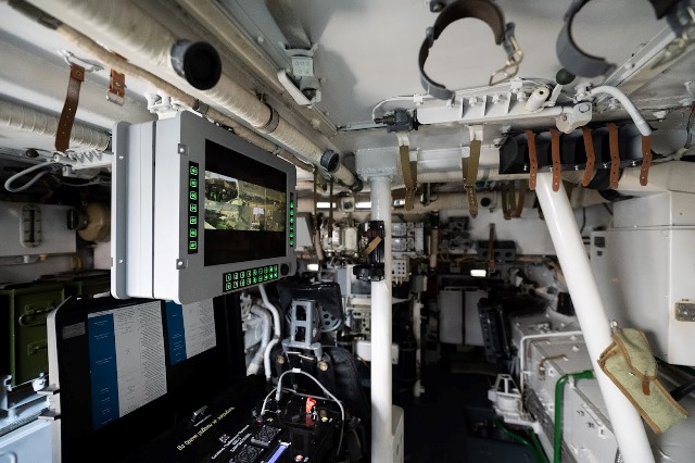 La parte interior incluye pantallas de presentación que facilitan a los operadores el control de los distintos sistemas incorporados en el blindado BT-3F. (ROSTEC)