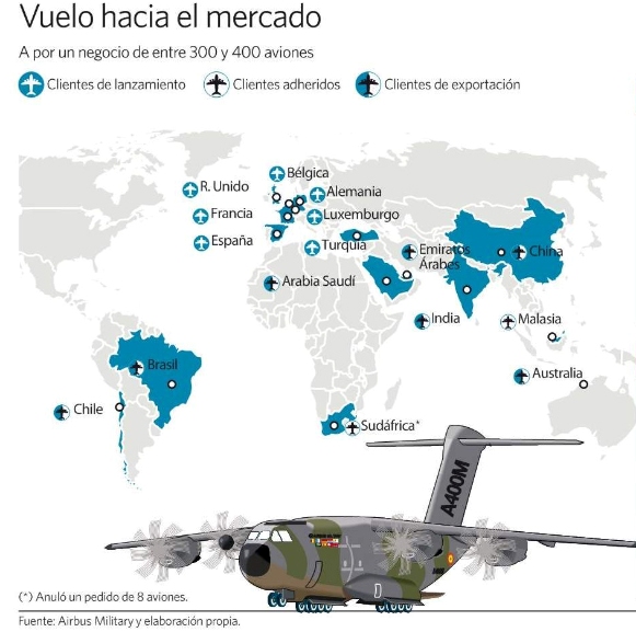 Y es aquí donde puede aparecer otro foco de conflicto en el prograelEconomista ma. En el caso de España, Defensa ya ha decidido quedarse con 14 de las 27 unidades encargadas y exportar las otras 13. El problema es que podría chocar los intereses de EADS con los de cada país. La compañía presidida por Tom Enders aseguró el pasado 30 de septiembre a esta publicación que intentarán cerrar en un año el primer contrato de exportación con un país de Oriente Medio, justo una de las zonas de influencia históricas para la antigua Construcciones Aeronáuticas, que ya sabe lo que es vender aviones de transporte militar en esos países. El lunes, Pedro Argüelles hacía hincapié en que España ha cumplido su parte del contrato firmando la compra de las 27 unidades a la Occar (Organización Conjunta de Cooperación en Materia de Armamento). En el futuro se verá qué uso se hace de esos A400M, aunque el Ejército maneja estudios en los que se asegura que las necesidades de las Fuerzas Armadas se cubren con 14 aparatos. Pero los intereses de los países de lanzamiento deben conjugarse con la rentabilidad del programa. El pedido de China podría ser su tabla de salvación.