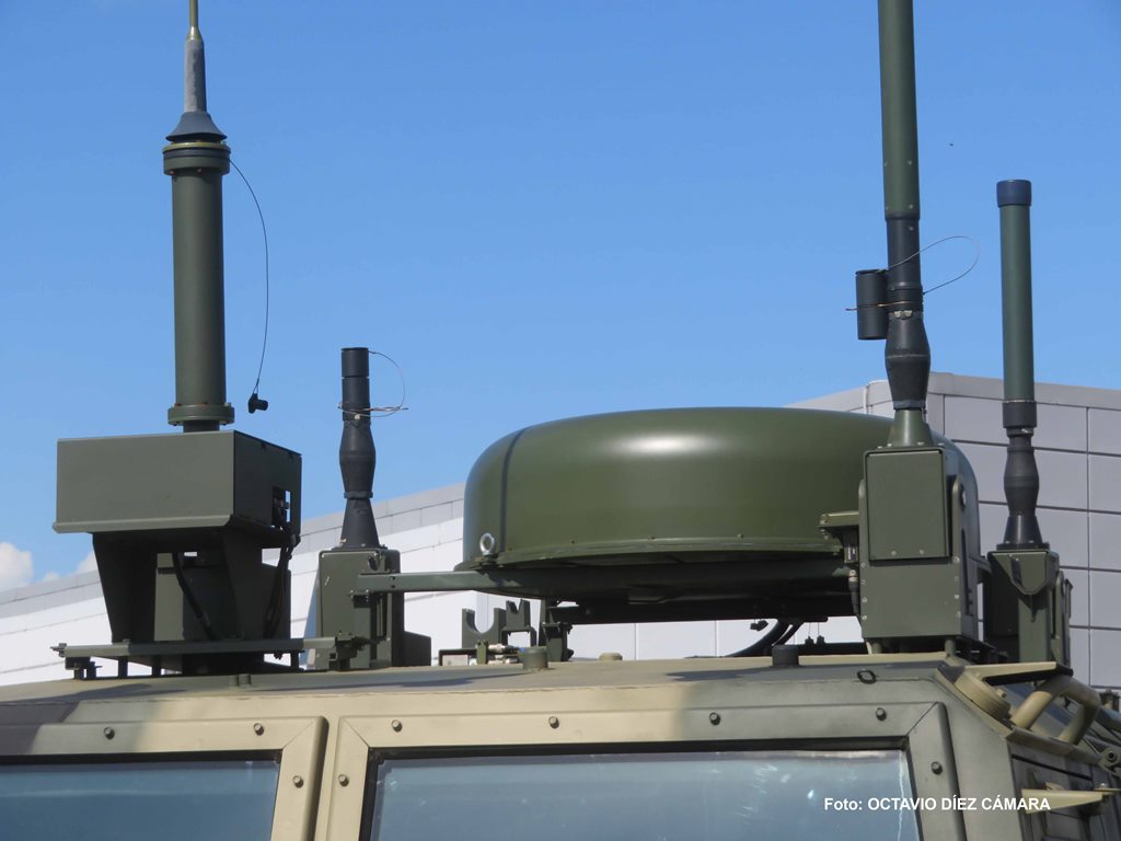 La antena circular de enlace por satélite y las otras para comunicaciones radio permiten mantener enlaces con el vehículo portador en movimiento. (Octavio Díez Cámara)