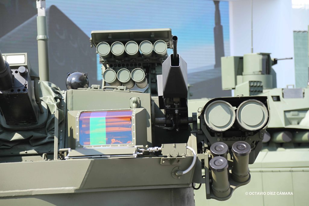 Complementariamente, en la misma torre hay una ametralladora media auxiliar de 7,62mm proporcionada por Kalasnikov que está localizada en el exterior de la torre y se mueve a la vez que el cañón principal. Dos módulos triples de lanzafumígenos completan este diseño de Rusia. Se proponen distintas configuraciones de este último que se diferencian en la ubicación de los diferentes elementos y en la incorporación o no de un módulo superior con sensores adicionales para una mejor vigilancia diurna y nocturna. (Octavio Díez Cámara)