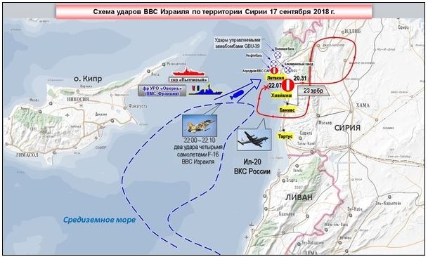 Según el Kremlin cuatro cazabombarderos F-16I Sufa de la IAF (Israel Air Force) que estaban atacando objetivos en la región costera siria de Latakia, se aproximaron al Ilyushin para cubrir su firma radar las defensas antiaéreas de Damasco, que lógicamente trataban de derribarlos. El ministro de Defensa de Rusia, Sergei Shoigu ha acusado al Gobierno de Jerusalén del incidente, atribuyéndoles el martes día 18 la "entera responsabilidad" del derribo del Il-20M, y la muerte de los 15 militares rusos que iban a bordo, de los que buena parte eran los valiosos operadores de los sistemas de EW (Electronic Warfare) del aparato. Además, el ministro afirmó que Rusia se reserva "el derecho a responder" en el futuro, además convocó al embajador de Israel acreditado en Moscú.