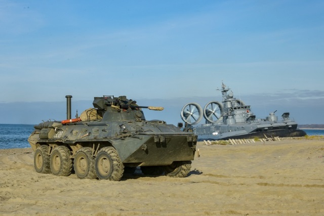 Uno de los BTR-82A de la infantería de Marina de la Flota del Báltico, al fondo se ve el LCAC del Proyecto 12322 del que acaba de desembarcar. (foto Ministerio de Defensa de Rusia).