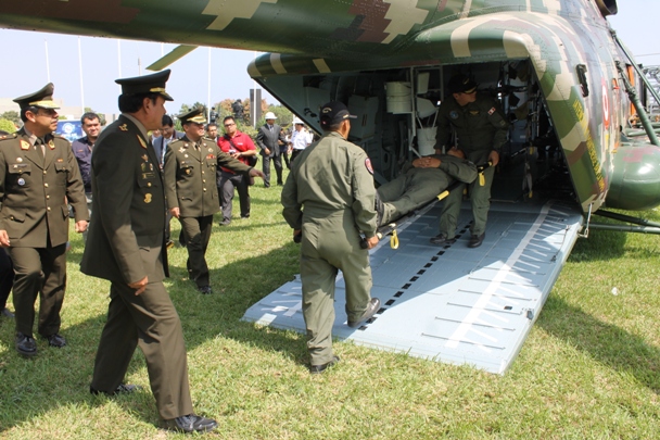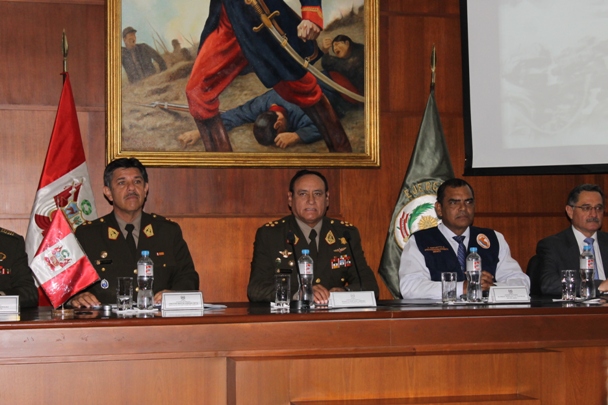 (defensa.com) El Comandante General del Ejército del Perú, general de Ejército Ronald Hurtado Jiménez, dio a conocer en una conferencia de prensa los alcances del V Salón de Tecnologías para la Defensa y Prevención de Desastres Naturales - SITDEF 2015 que se inaugura el 14 de mayo. En la conferencia, realizada en las instalaciones del Cuartel General del Ejercito, Hurtado Jiménez, acompañado del Director de Informaciones, General de Brigada EP Orestes Vargas Ortiz, y del Jefe del Instituto Nacional de Defensa Civil (INDECI),General de División EP (r) Alfredo Murgueytio, manifestó que “SITDEF es un punto de partida para el planeamiento que realizan las instituciones para la adquisiciones de material de Defensa. Es un punto de encuentro que permite mejorar la tecnología y el equipamiento de nuestras Fuerzas Armadas”. Al término de la presentación se realizó un breve recorrido por las instalaciones, pudiéndose visitar los Pabellones “Inka” y “Wari”– que comprenden en conjunto un área de 18.000 metros cuadrados. En el recorrido outdoor se pudo apreciar, entre otros, un helicóptero de transporte y combate Mi-171Sh-P Hip H en configuración ambulancia, además de un carro de combate T-55 y una batería antiaérea ZU-23-4 Shilka de 23 mm.