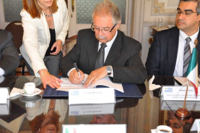 El ministro de Defensa Nacional uruguayo, Dr. Jorge Menéndez, suscribió un Acuerdo Marco de Defensa entre el Ministerio de Defensa Nacional y el Ministerio de la Defensa Italiano tras meses de negociaciones. Bajo la modalidad de «firma disyunta», ha sido suscrito primeramente en Italia por parte de la Ministra de Defensa, Roberta Pinotti. Brinda el marco para la cooperación en formación y capacitación del personal civil y militar, cooperación técnica-científica y de sanidad, entre otras áreas. La reunión técnica bilateral entre ambos ministerios abordó la instrumentación de las áreas de trabajo del Acuerdo Técnico suscrito en 2011 con cierta prisa y sin las mismas garantías.