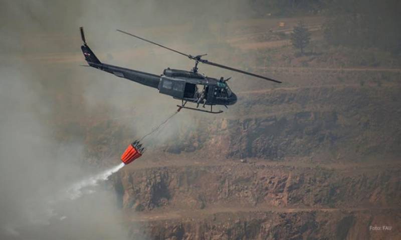 En las semanas anteriores, tanto los Bomberos, como el Ejército, y la Fuerza Aérea, tan sólo con uno o dos helicópteros UH-1H disponibles, han debido redoblar esfuerzos para dominar diversos focos ígneos. La Aviación Naval, por su parte, dispone solo de un Bambi Bucket para sus Bell 412. (Javier Bonilla)