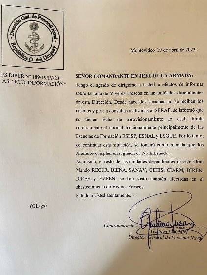 El Director General de Personal Naval e Inteligencia Estratégica del Ministerio de Defensa, Contralmirante Gustavo Luciani, denunció al Comandante en Jefe de la Armada Uruguaya, Almirante Jorge Wilson, tras consulta a su respectivo Servicio de Aprovisionamiento (SERAP), la falta de víveres frescos desde hace semanas, en las instituciones didácticas y en las direcciones de Bienestar y Sanidad Naval, por lo cual se impondría, en el caso de los alumnos y docentes afectados, suspender el régimen de internado mientras esta situación se extienda o no se solucione.