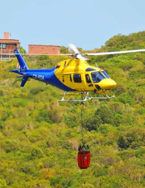 Ante la escasa disponibilidad de aeronaves militares debido al estado de postración económica en que se encuentran las Fuerzas Armadas de Uruguay, al denodado y habitual esfuerzo de un helicóptero Bell UH-1H de la Fuerza Aérea, que días atrás, junto a otras aeronaves de la FAU ,bomberos e integrantes del Ejército, combatiera un agresivo foco ígneo en los balnearios oceánicos próximos a la frontera con Brasil, el gobierno saliente (que no destinó cuando solicitados, fondos suficientes para mantenimiento aeronáutico militar), se vio obligado a contratar unidades privadas, ante lo cual recurrió a un AW 119 dotado de helibalde, el cual se radica en Uruguay durante el verano y parte de la primavera y otoño australes, y cumple tareas en España durante los veranos boreales, usualmente en vigilancia forestal.