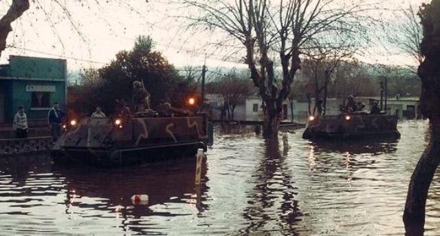 (defensa.com) El Regimiento Tte. Gral. Pablo Galarza de Caballería Blindado Nº 2 del Ejército Nacional Uruguayo se encuentra apoyando al Centro Coordinador de Emergencias de Durazno. Se han afectado a esta labor oficiales, cocineros, rancheros, conductores, apoyo para traslado de pertenencias a damnificados, armado de carpas, enfermeros, distribución de raciones y demás actividades conexas. Además, vehículos de Transporte Blindado de Personal M-113 recorren las zonas inundadas gracias a su capacidad anfibia. La Fuerza Aérea, por su parte, realizó un vuelo de reconocimiento para visualizar y tomar registro de la situación para determinar cuáles han sido las zonas afectadas o de mayor riesgo por las inundaciones en un helicóptero Bell UH-1 H "Iroquois" del Escuadrón Nº 5 arribado desde la Brigada Aérea I (Carrasco).ç, además de otras salidas en aeronaves de ala fija.
