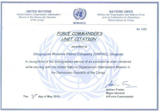 (defensa.com) La Compañía Uruguaya de Patrulla Fluvial de la Armada Nacional, URPAC MIKE 14, ha recibido un reconocimiento especial de la MONUSCO por su contribución operacional a la misión, bajo el mandato de Naciones Unidas, en la República Democrática del Congo. La “Mención del Force Commander para Unidades” le ha sido otorgada en reconocimiento a los servicios distinguidos en orden excepcional por la continua contribución operacional a la misión durante el periodo de abril 2012 a abril de este año. La URPAC se encuentra actualmente desplegada en dos áreas de operaciones, el Lago Kivu y el Lago Tanganika, al oeste del país, en las fronteras de Ruanda y Burundi (país este último que también tuvo observadores navales uruguayos anteriormente).