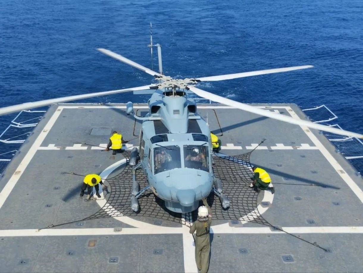 Maniobra de aterrizaje de un helicóptero Bell 412EP en la cubierta de vuelo del AB Comandante Eterno Hugo Chávez (GC-24). (Foto: Armada de Venezuela)