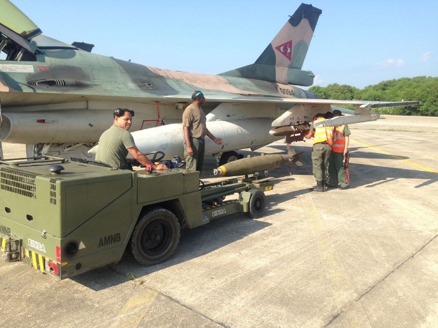 Lockheed Martin F-16A/B Fighting Falcon Block 15 del Grupo Aéreo de Casa N° 16 armándose con bombas MK.82 para una acción de apoyo aéreo
