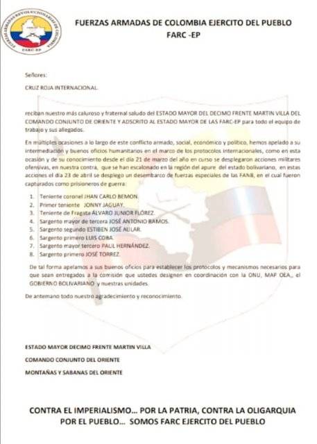 Según un comunicado recibido por el Comité Internacional de la Cruz Roja (CICR), y que fuera hecho público el lunes 10 de mayo, el Estado Mayor del Frente Décimo “Martin Villa” de las disidencias de la Fuerzas Armadas Revolucionarias de Colombia - Ejército del Pueblo (FARC EP), la organización guerrillera colombiana, informa que ha hecho prisioneros de guerra a ocho integrantes de las fuerzas especiales venezolanas, más precisamente a miembros de la 99 Brigada de Fuerzas Especiales “General en Jefe Félix Antonio Velásquez” (entre los que encuentra el comandante del 992 Batallón de Fuerzas Especiales “General en Jefe José Gregorio Monagas”) y de la 8ª Brigada de Comandos del Mar Generalísimo Francisco de Miranda.