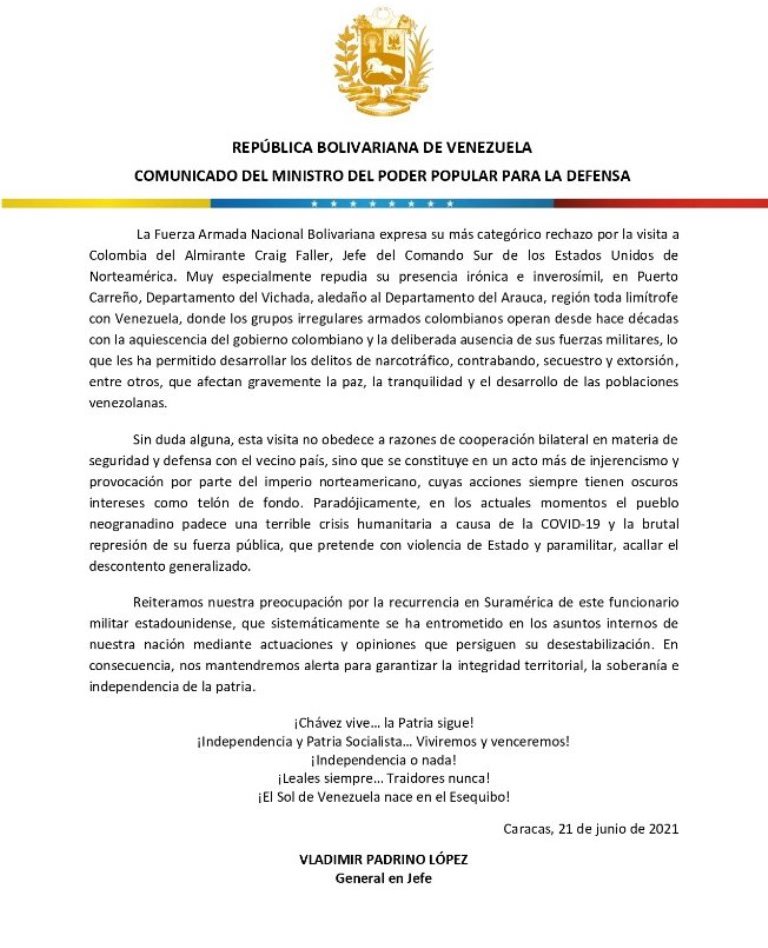 La información se dio a conocer a través de un Comunicado Oficial del Ministerio para la Defensa de Venezuela que difundido por Padrino López, titular de la mencionada cartera a través de la red social Twitter. En el documento, el jefe castrense se preguntó lo siguiente: “Mientras el Jefe del Comando Sur visita Puerto Carreño en Colombia, se realizan ejercicios Tradewinds 2021 en Guyana con presencia de militares estadounidenses ¿Casual?”.