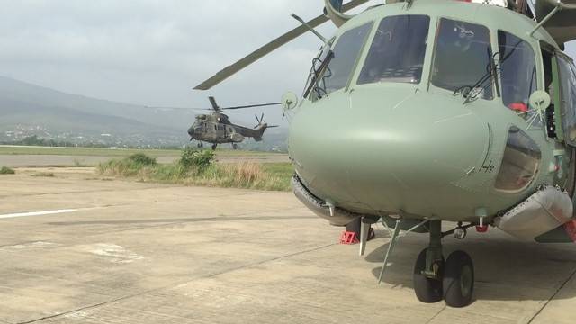 Fotografía: Primer plano un Mi-17V5 del Escuadrón Aeronaval de Apoyo Táctico de la Armada Bolivariana y en segundo plano un Airbus Helicopters AS-532AC Cougar del Grupo Aéreo de Operaciones Especiales N° 10 “Cobras”.