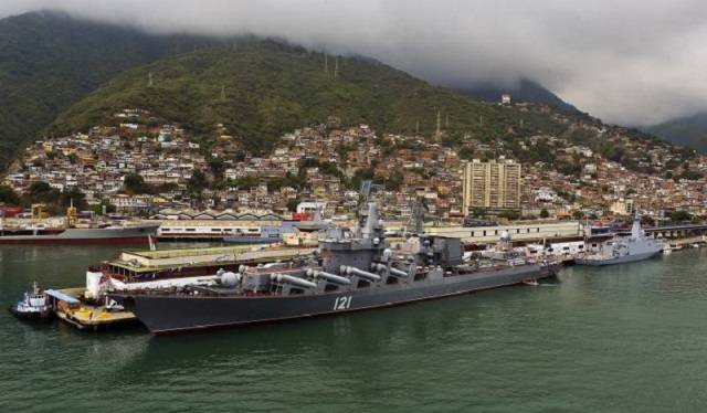 Fotografía: El crucero ruso Moskva” en el puerto venezolano de La Guaira, a su derecha se ve unos de los “patrulleros” de la Armada Bolivariana construidos en España por Navantia.