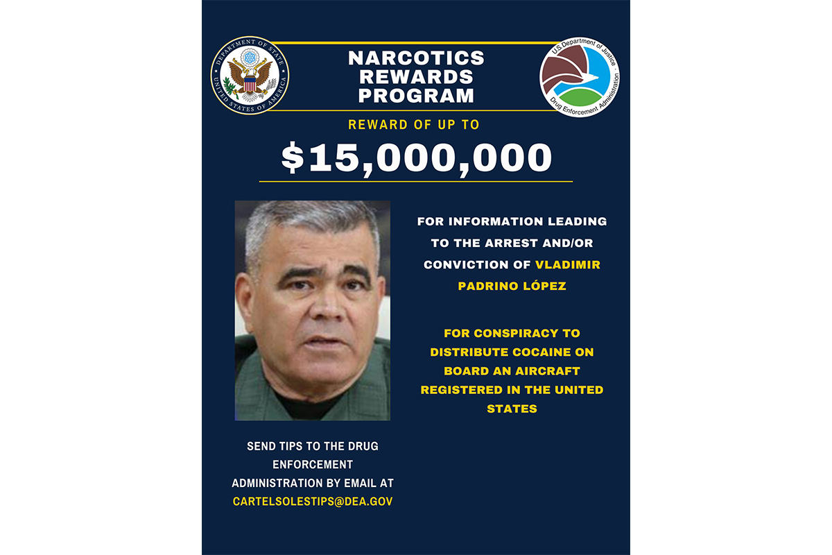 Como respuesta del apoyo que ha recibido Maduro Moros por parte del Alto Mando militar, Washington ha impuesto una nueva recompensa para facilitar la detención del ministro de Defensa, general en jefe (EJ) Vladimir Padrino López, por quien se ofrece hasta 15 millones de dólares, medida que ha sido rechazada mediante un comunicado, en el que la institución castrense ha expresado que “una espuria recompensa no hará mella en la fortaleza física y espiritual de ambos reconocidos líderes, quienes se mantendrán firmes como el roble y erguidos como el samán, para seguir conduciendo acertadamente la nación”.