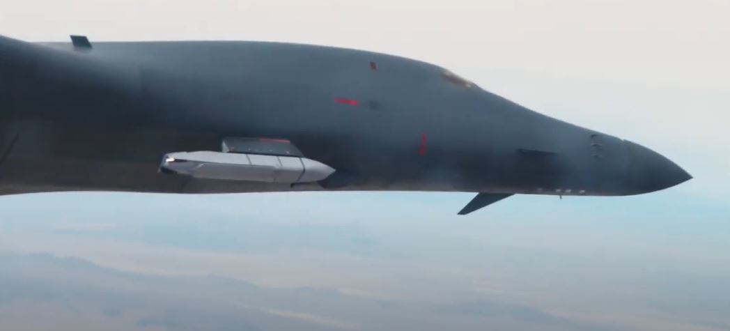 Bombardero supersónico B-1B Lancer portando un misil AGM-158 JASSM (Joint Air-to-Surface Standoff Missile) de Lockheed Martin (Vídeo: alert5).