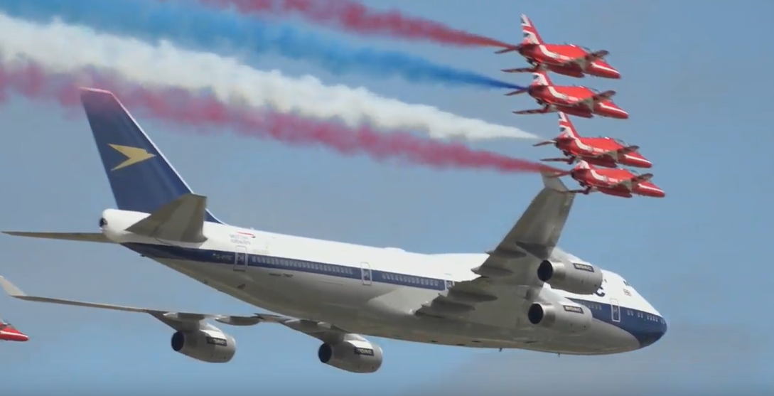 Preciosas imágenes que nos han dejado un Jumbo 747 de Britsh Airways junto a nueve Hawk pertenecientes a la Royal Air Force Aerobatic Team, los Red Arrows RIAT 2019