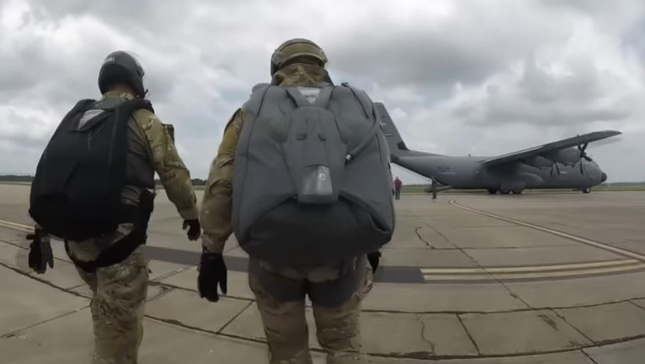 Lanzamiento de Humvees desde un Globemaster y paracaidistas saltando desde un Hércules C-130 de la USAF