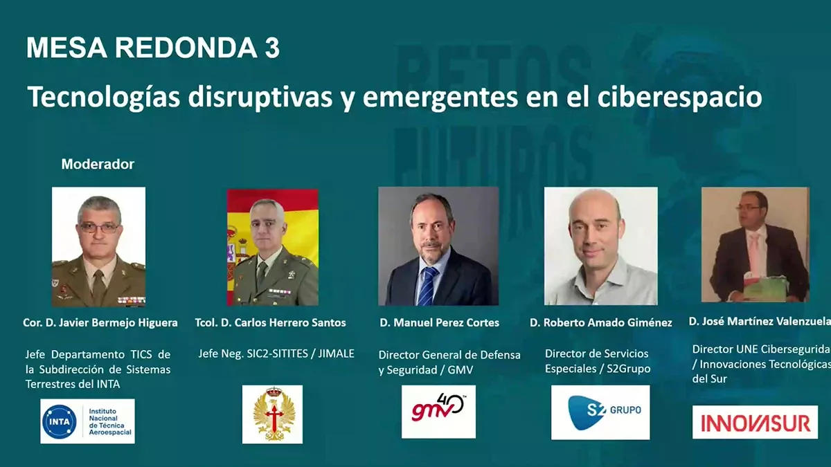 En ella ejerció de moderador el coronel Javier Bermejo Higuera, jefe de comunicaciones y seguridad informática TICS INTA y participaron: el teniente coronel Carlos Herrero Santos, jefe del Negocio de simulación del Mando de Apoyo Logístico; Miguel Pérez Cortés, director general de Defensa y Seguridad de GMV; Roberto Amado Giménez, director de servicos especiales de S2 Grupo; y José Martínez Valenzuela, Responsable de Negocio de Ciberseguridad y Cumplimiento Normativo en Innovasu.