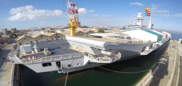 El portaaviones Cavour se encuentra en el histórico dique seco de Ferrati sometiéndose a trabajos periódicos de mantenimiento y a la instalación de un refuerzo metálico en su cubierta que hará posible soportar el impacto termodinámico que sobre ésta someterán los F-35B. (Vídeo: Marina Militare)
