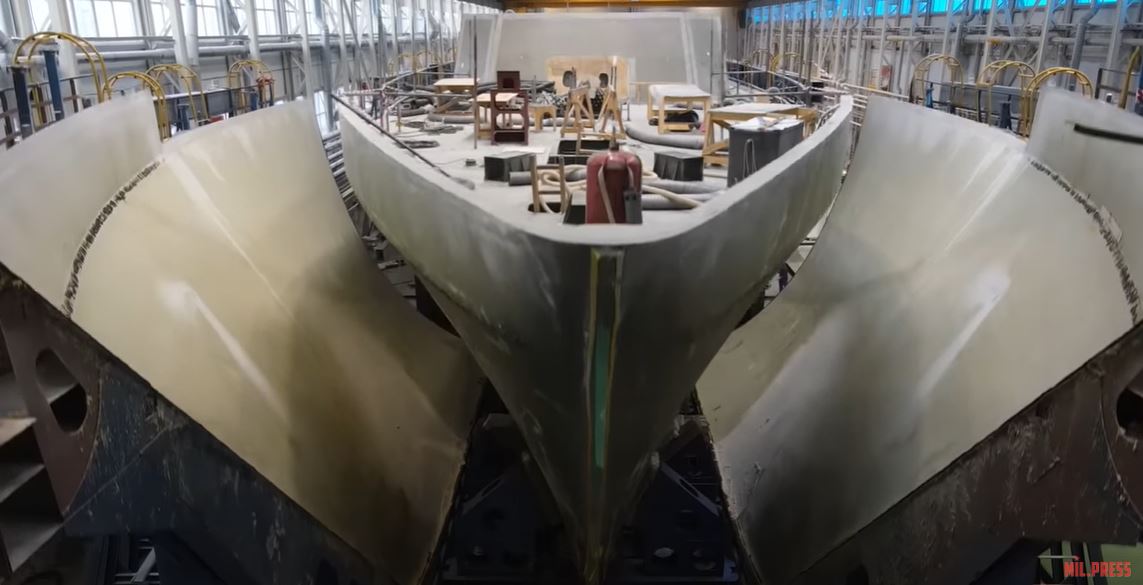 De esta manera se extrae del molde un casco del dragaminas «A. Shlemov», de la clase «Alexandrit» . Se trata de un casco de fibra de vidrio de una sola pieza, con una longitud de 80 metros y moldeado por infusión al vacío. (Vídeo: Mil.Press)
